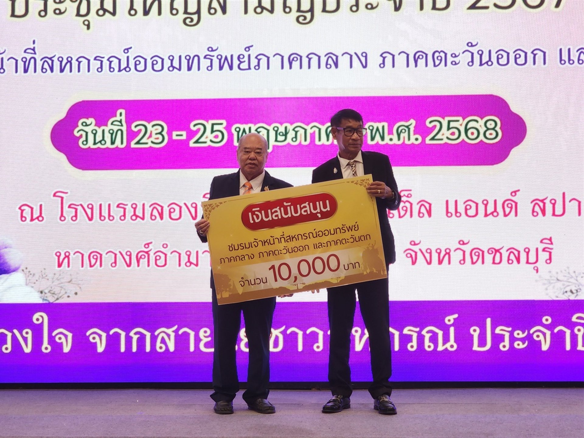 บริษัท สหประกันชีวิต จำกัด (มหาชน) โดย พล.ต.ต.ธงชัย โตงาม รองกรรมการผู้จัดการ สายงานตลาดประกันชีวิต พร้อมเจ้าหน้าที่ เข้าร่วมการประชุมใหญ่สามัญ ประจำปี 2567 ชมรมเจ้าหน้าที่สหกรณ์ออมทรัพย์ภาคกลาง ภาคตะวันออก และภาคตะวันตก ซึ่งจัดขึ้นระหว่างวันที่ 23 - 25 พฤษภาคม 2568 พร้อมมอบเงินสนับสนุน จำนวน 10,000 บาท ณ โรงแรมลองบีช การ์เดน แอนด์สปา อำเภอบางละมุง จังหวัดชลบุรี